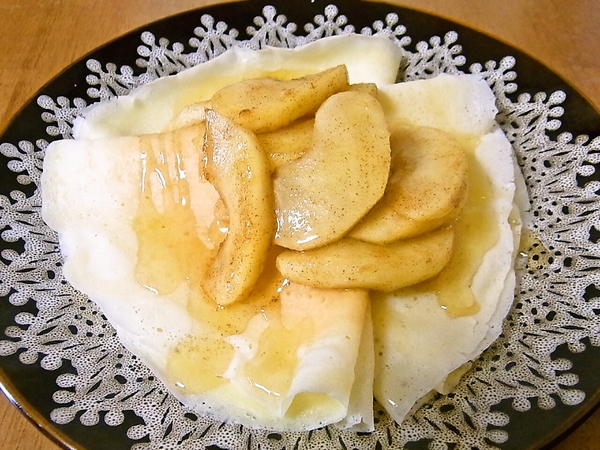 バターで焼いて、シナモンで香りをつけたりんごと、はちみつで食べてみました。