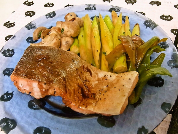付け合せは、マッシュルーム、アスパラ、ピーマンの塩焼き。
