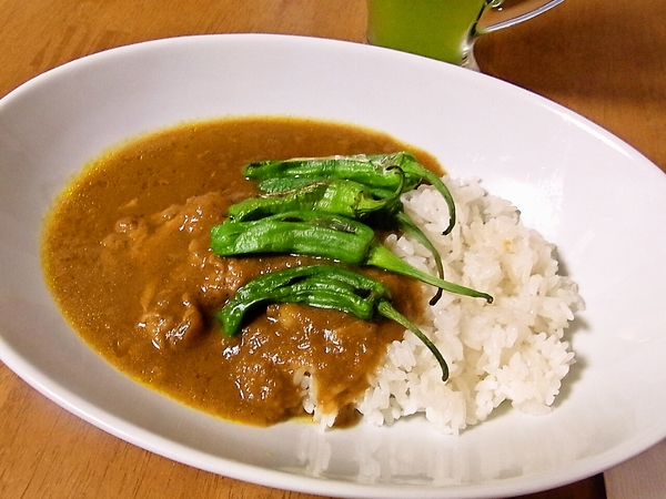 カレーはレトルト。焼いたししとうをトッピングしました。