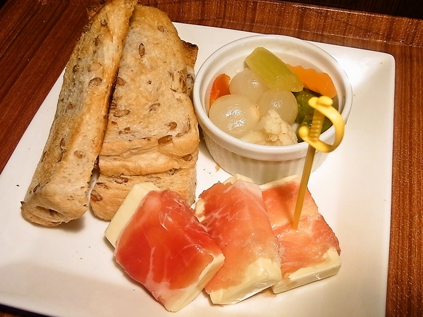 ライ麦トースト、わさびチーズの生ハム巻き、野菜ピクルス。