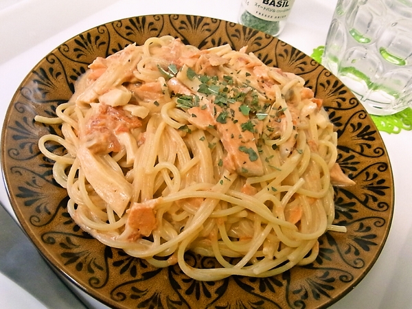 鮭とエリンギのトマトクリームチーズスパゲッティ