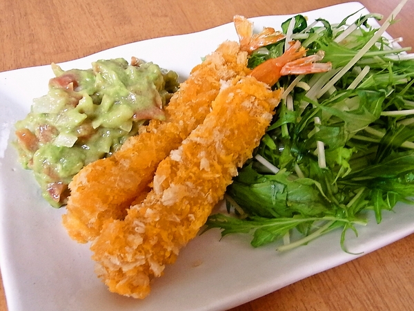 海老とワカモレは合うので、昨日の残りの海老フライに添えてみました。