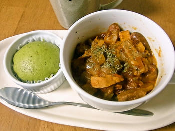 牛モツのトマト煮込み、抹茶蒸しパン、烏龍茶