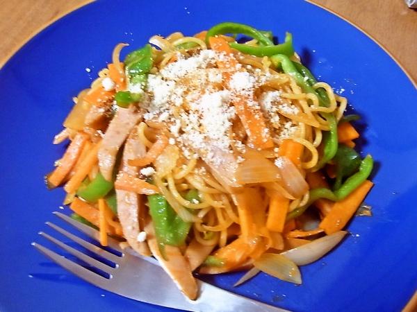 焼きそばの麺を使って、ナポリタン風に味付けしてみました。