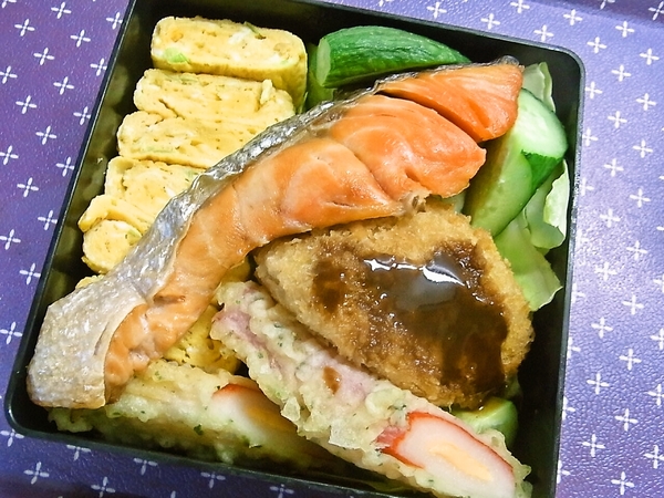 ネギ入りの玉子焼き、焼き鮭、コロッケ、チーズカニカマ天