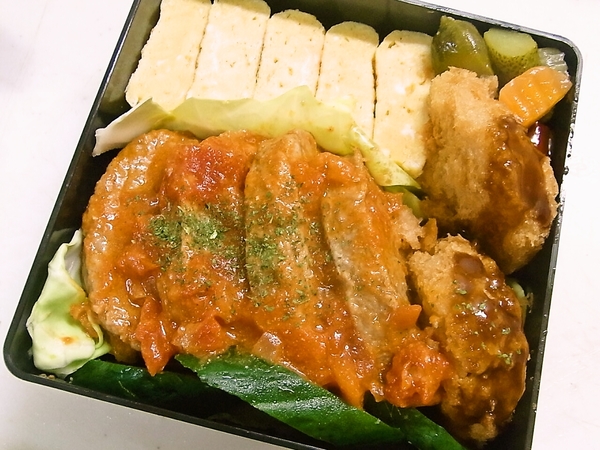 あとは玉子焼き、残りのコロッケ、隙間埋めにピクルス。