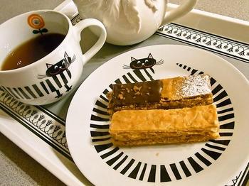 お菓子はココフランという駅構内の洋菓子屋で買ったミルフィーユ。