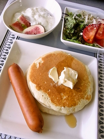 パンケーキ、ジョンソンヴィルのソーセージ、サラダ、いちじくとヨーグルト