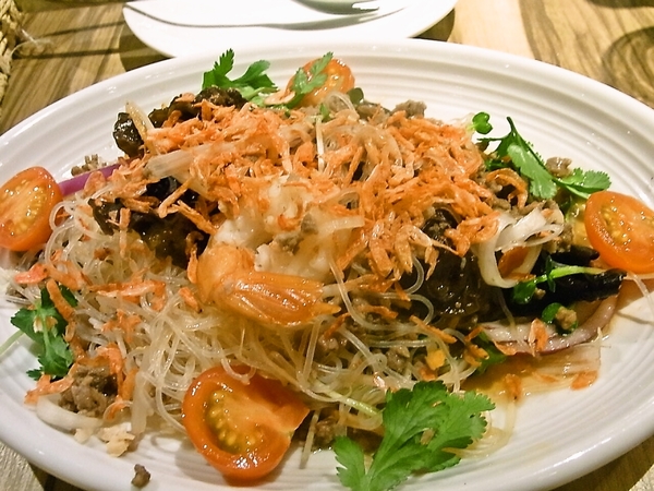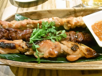 アジアンカフェっぽい店でバリ島のビールと、エビ春雨サラダ、サテ三種盛り。