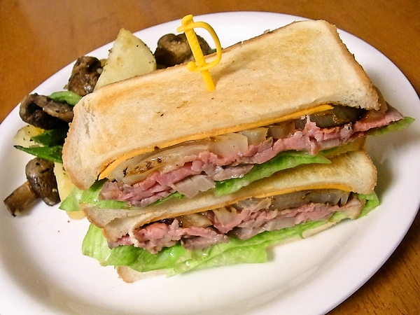 チェダーチーズ、輪切りのローストオニオン、ローストビーフ、