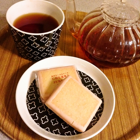 四角いクッキーの間に、バタークリームとチェリージャムが挟んであります。