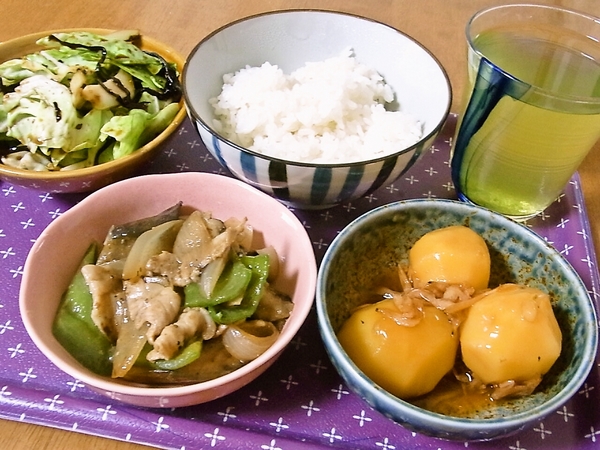 ナスとピーマンの豚味噌炒め、桜えびとじゃがいもの煮物、キャベツと昆布の浅漬け