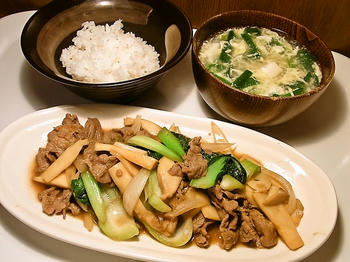 青梗菜とエリンギと牛肉のオイスターソース炒め、ニラ玉豆腐スープ