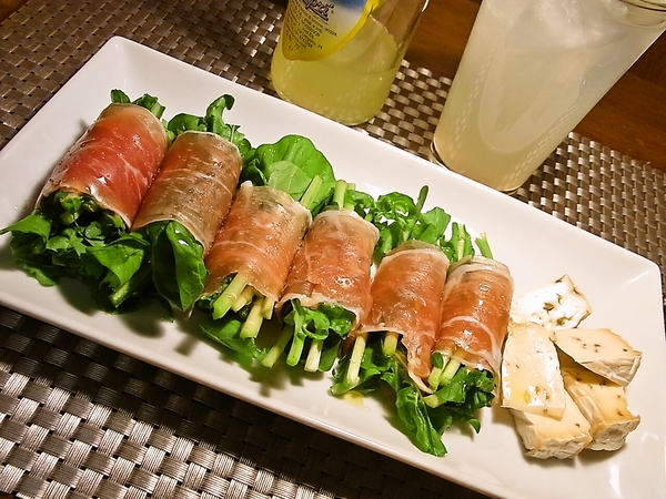 ルッコラを生ハムで巻いて、オリーブオイル少々に、塩をパラパラっと。