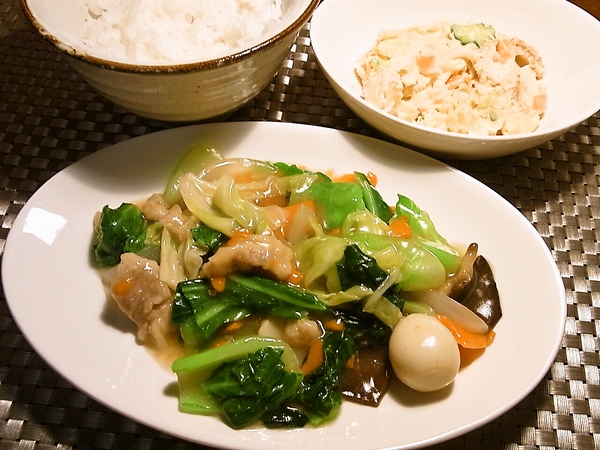 八宝菜、明太ポテトサラダ、ご飯