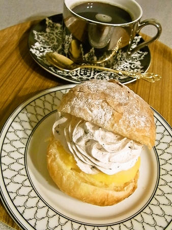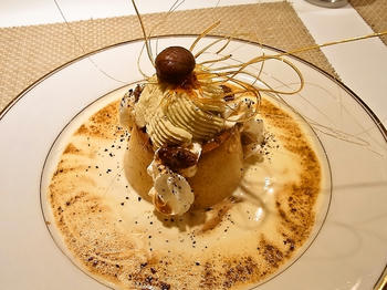 天辺に乗っているのは甘栗で、サイドのクリームに乗っているのは洋酒漬けの干しイチジク。