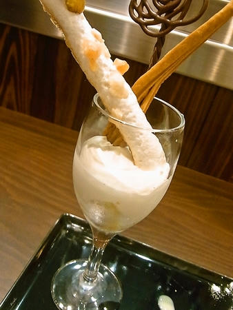 飴細工を折って、クリームとプリンと一緒に食べると、